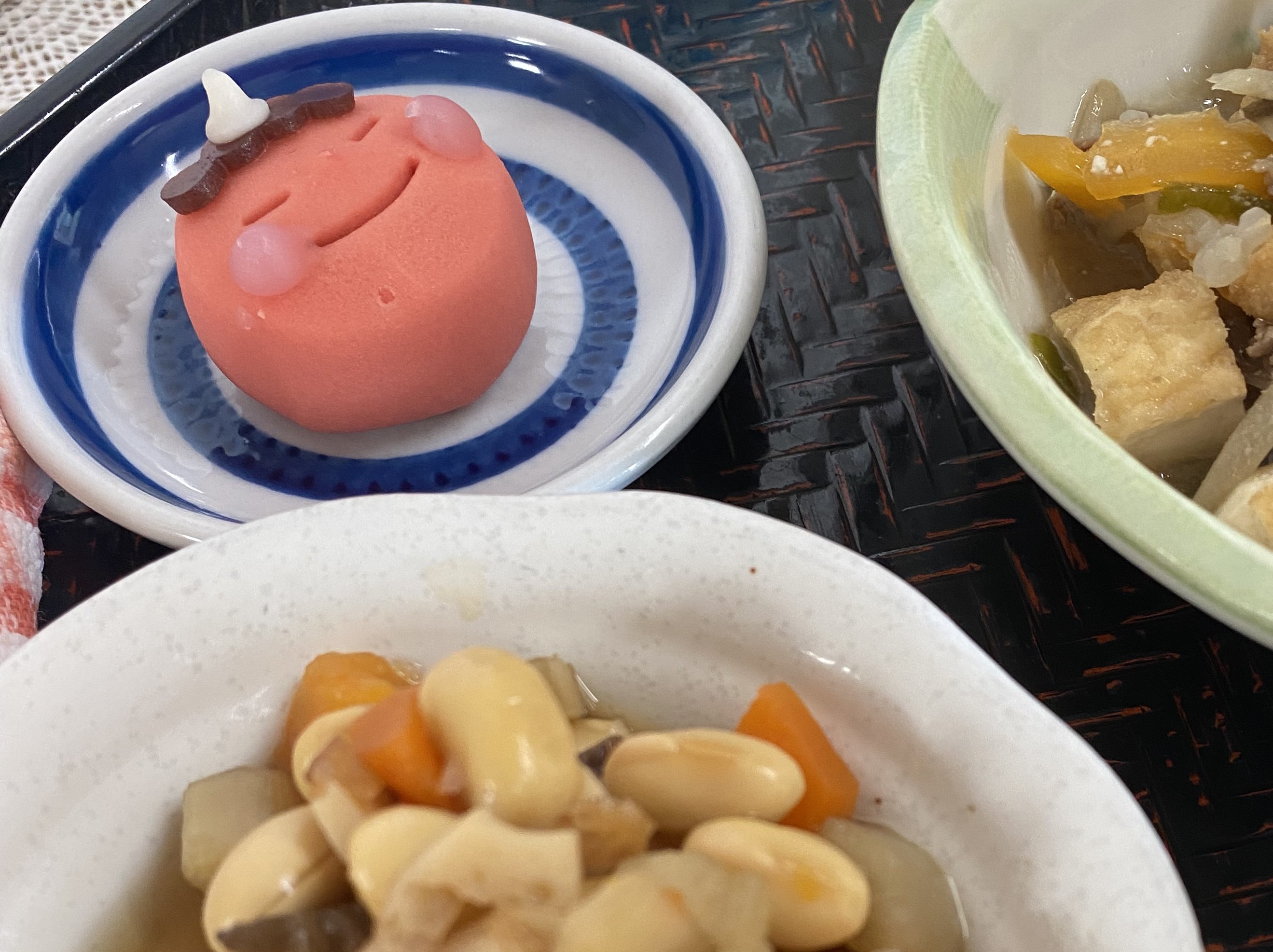 お昼ご飯は恵方巻き、大豆を使った料理と、赤鬼の練りきりを…